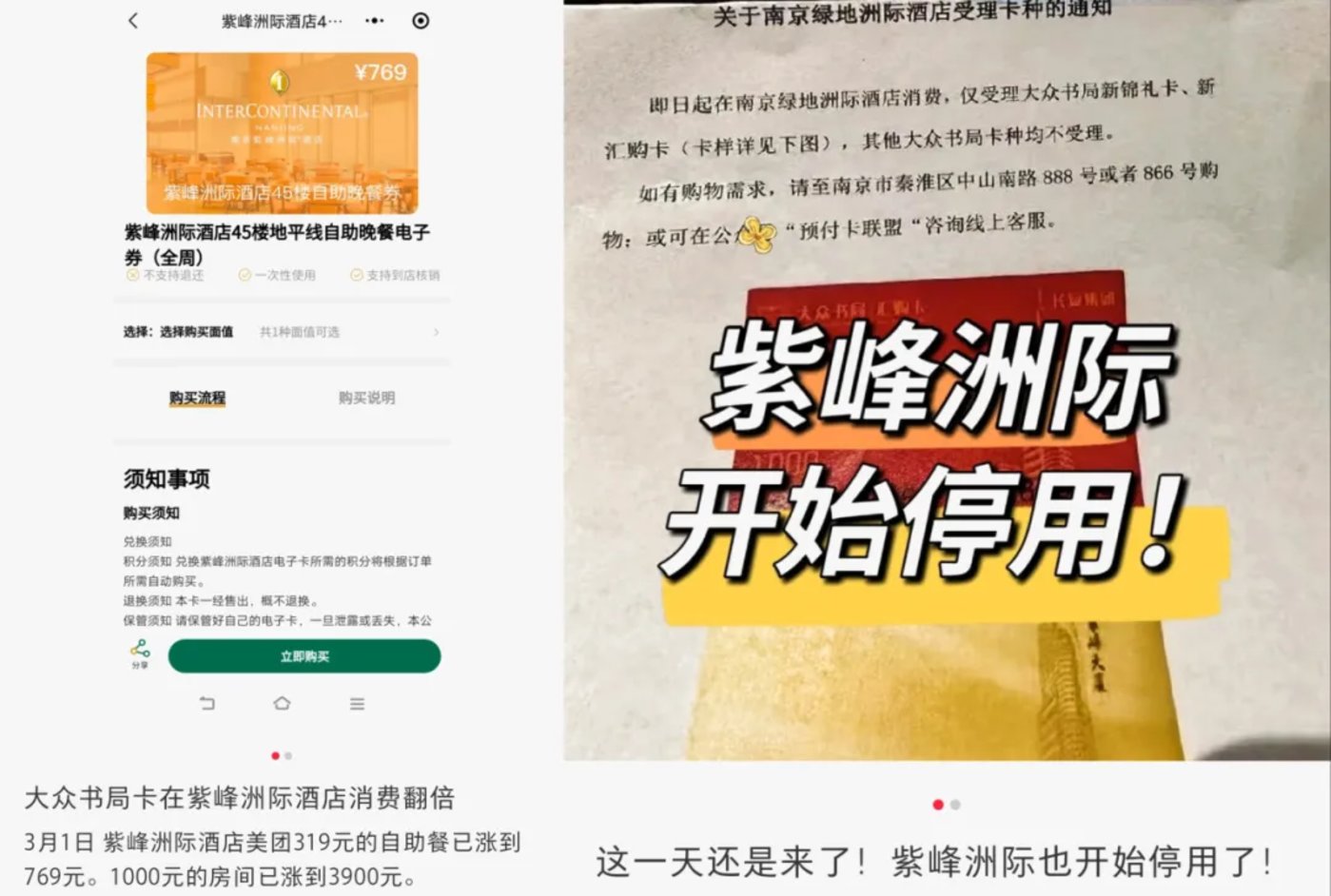 随后不久,南京紫峰洲际更是宣布限制使用大众书局卡进行消费。