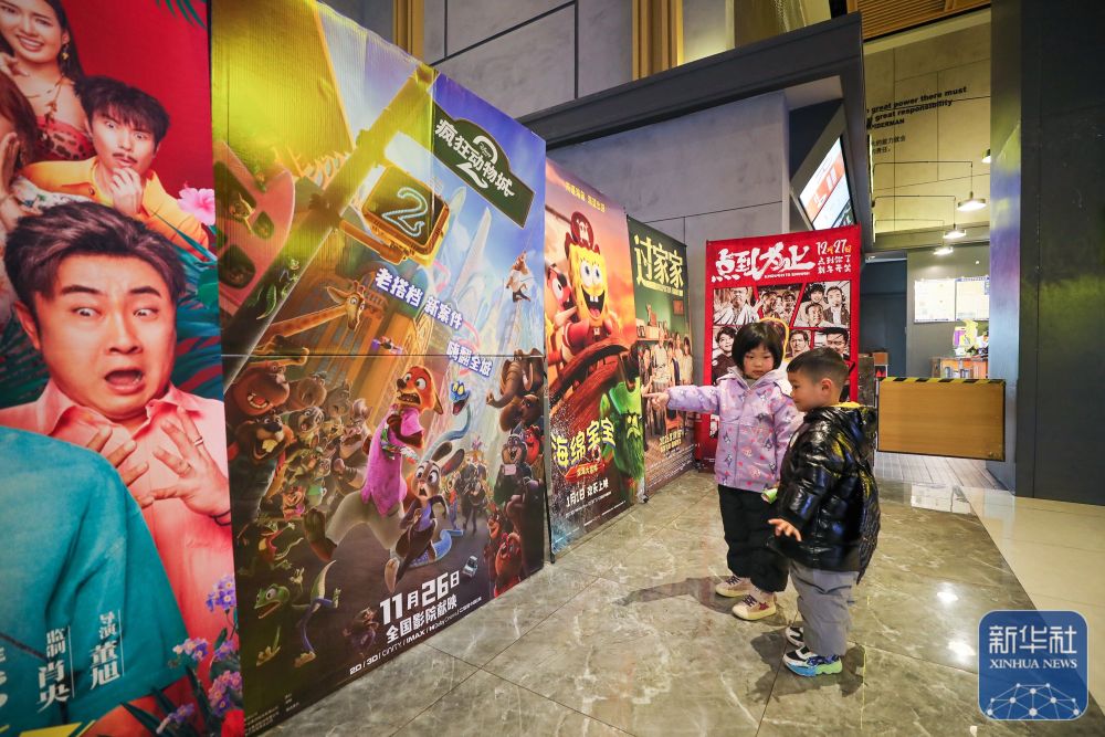 ↑ 1月2日,江苏省海安市一家影城,两名小朋友在观看电影《疯狂动物城2》海报。新华社发(顾彬斌摄)