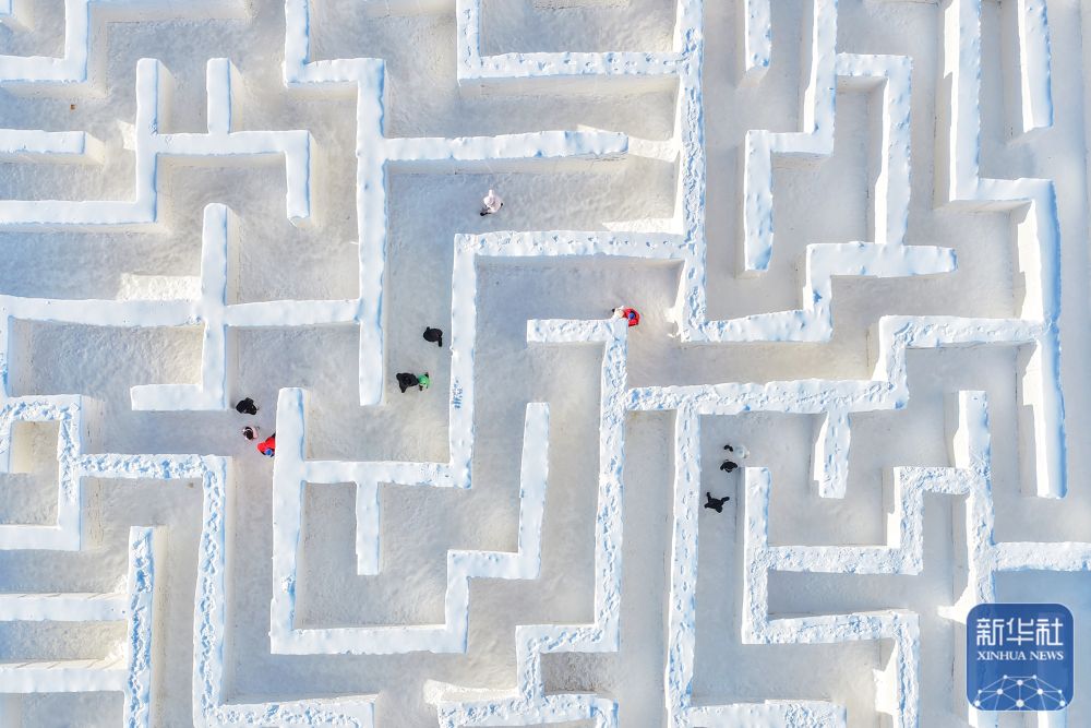 ↑ 1月2日,在黑龙江省同江市俄罗斯风情园,游人在冰雪迷宫里游玩(无人机照片)。新华社发(刘万平摄)
