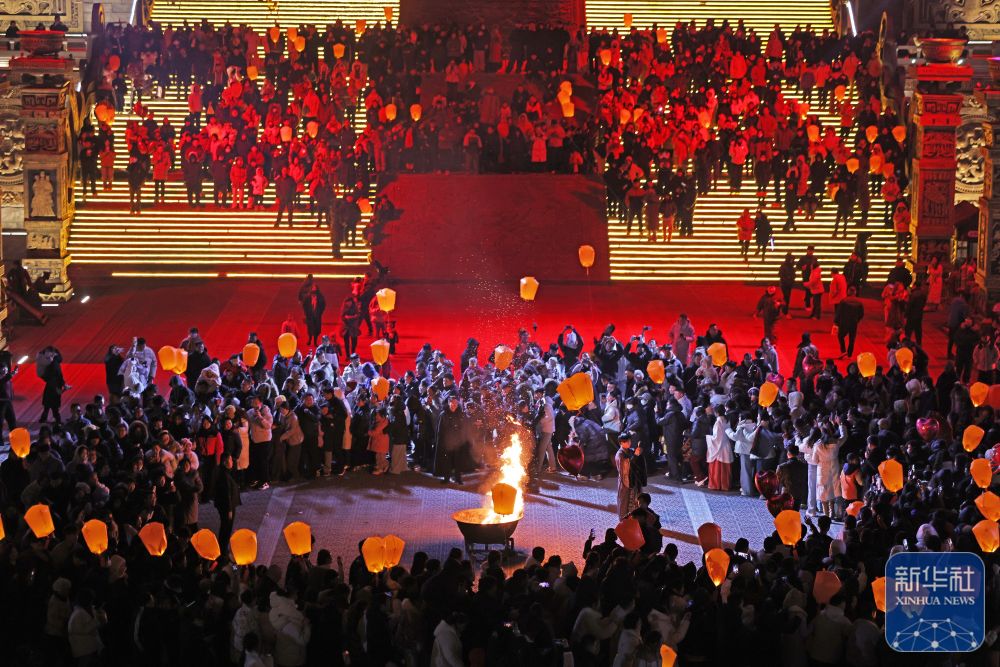 ↑ 1月1日,游客在山东乐陵影视城景区观看表演(无人机照片)。新华社发(贾鹏 摄)