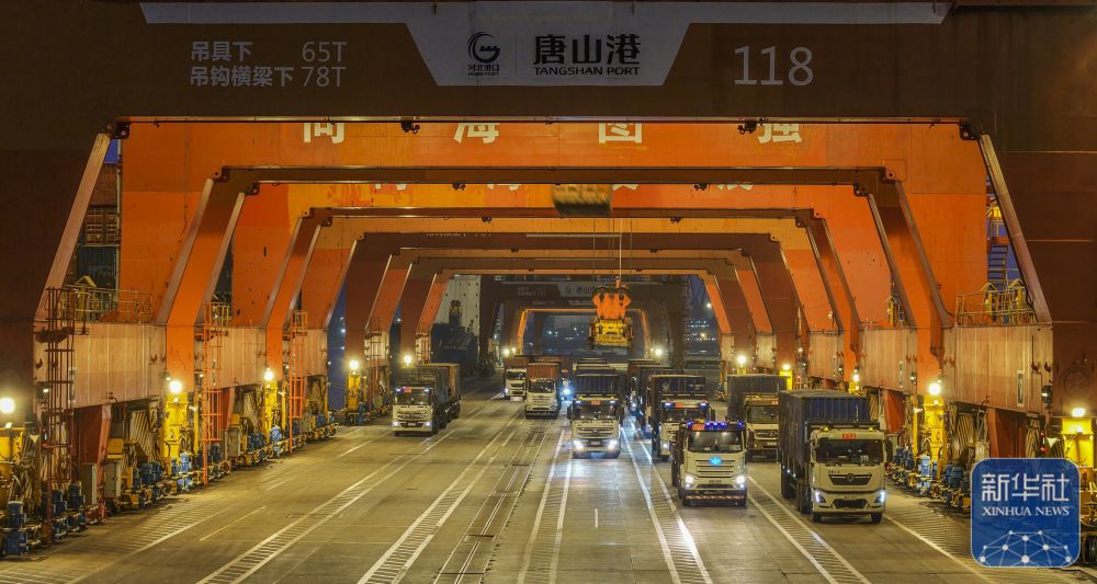 ↑ 1月2日清晨,在河北省唐山港京唐港区集装箱码头,车辆在运输集装箱(无人机照片)。新华社发(刘满仓 摄)