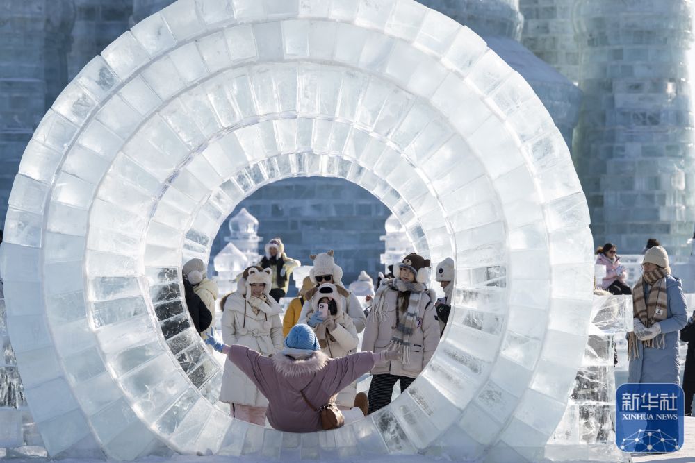 ↑ 1月2日,人们在哈尔滨冰雪大世界园区拍照。新华社记者 张涛 摄
