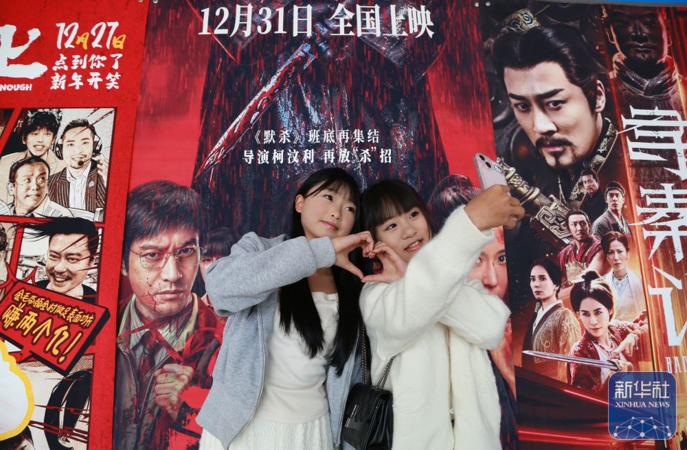 ↑ 1月1日,在云南省蒙自市一家电影院,观众与电影海报合影。新华社发(薛莹莹摄)