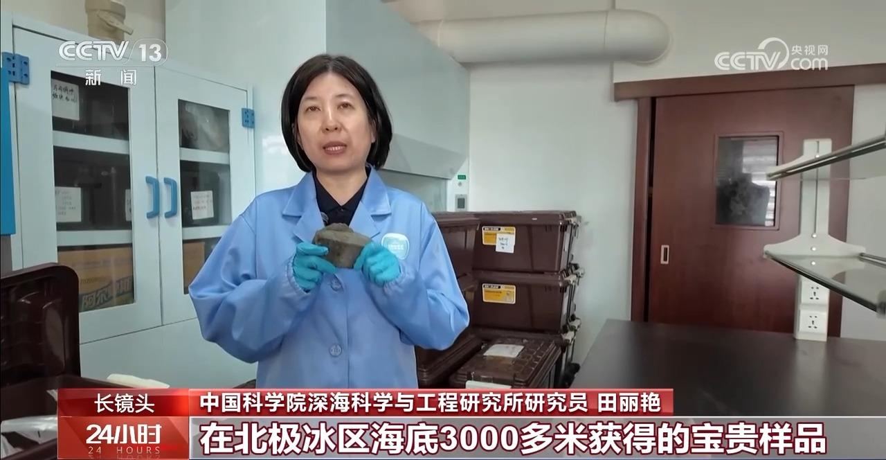 中国科学院深海科学与工程研究所研究员 田丽艳:这块黑色的玄武岩,就是我们首次北极载人深潜科考在北极冰区海底3000多米获得的宝贵样品,它是来自加克洋中脊的东段,位于地球上扩张速率最慢的地方之一。每年板块向两侧分离的距离不到20毫米,这里隐藏着地球深部地幔物质上涌的秘密,是我们解读地球演化历史的关键拼图。