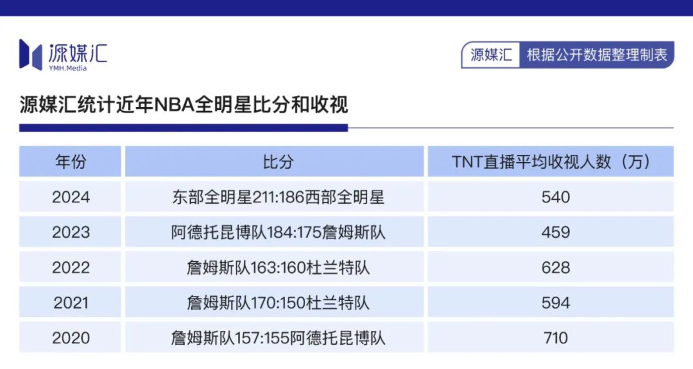 这5年间,NBA全明星周末正赛的TNT直播平均收视,从710万跌到540万。其中,2023年在犹他州盐湖城举行的一届,甚至低至创纪录的459万。