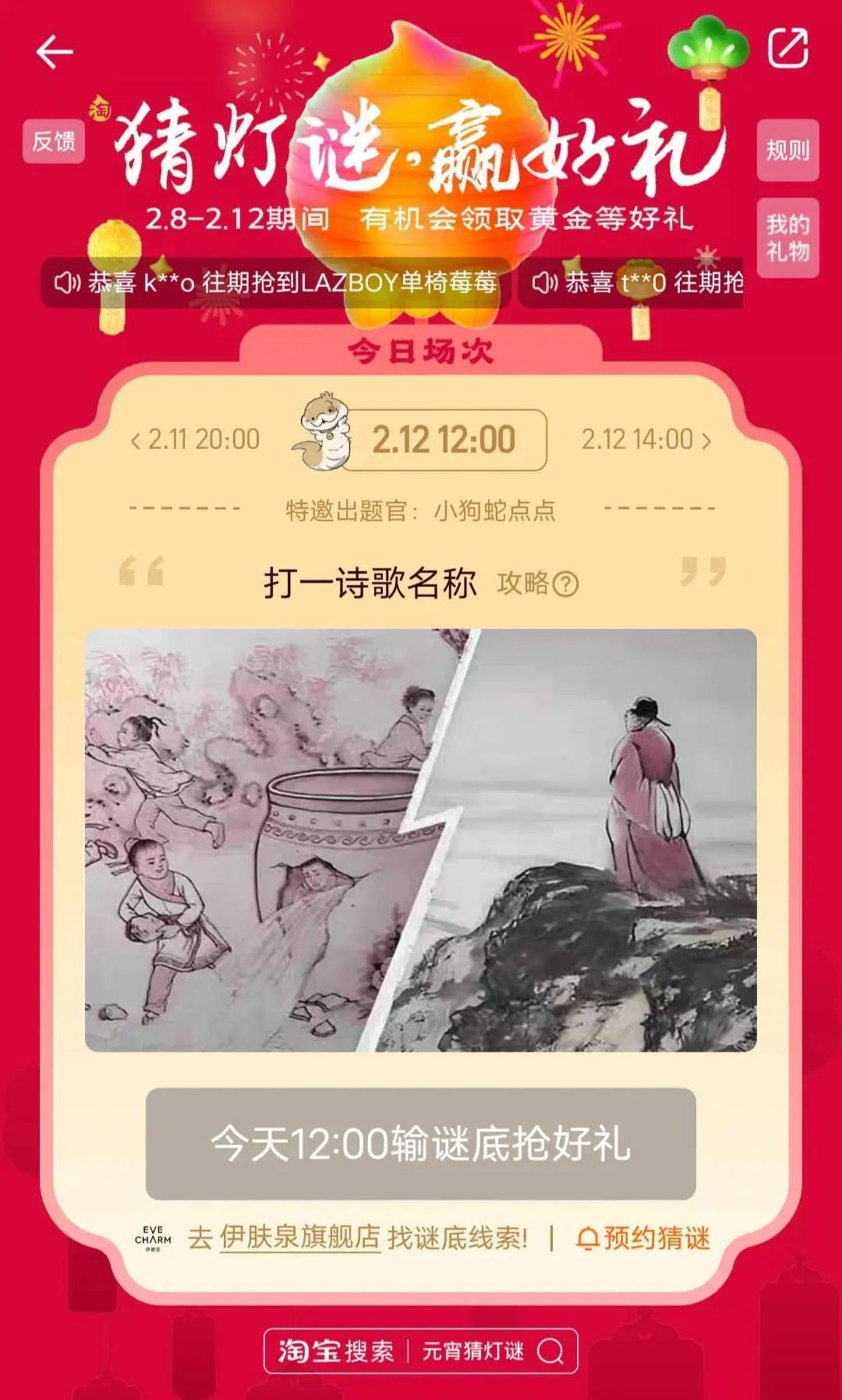 品品香的淘宝店铺也开通了“送礼物”功能,并接到了一些送礼订单。与微信小店不同,作为电商平台的前辈,淘宝的货盘供给更充足,“送礼物”与电商属性的结合也更紧密。蛇年央视春晚,淘宝以1分钱抢礼物的形式送出了价值1000万元的商品;元宵节前后,“猜灯谜”活动又吸引了众多用户参与。