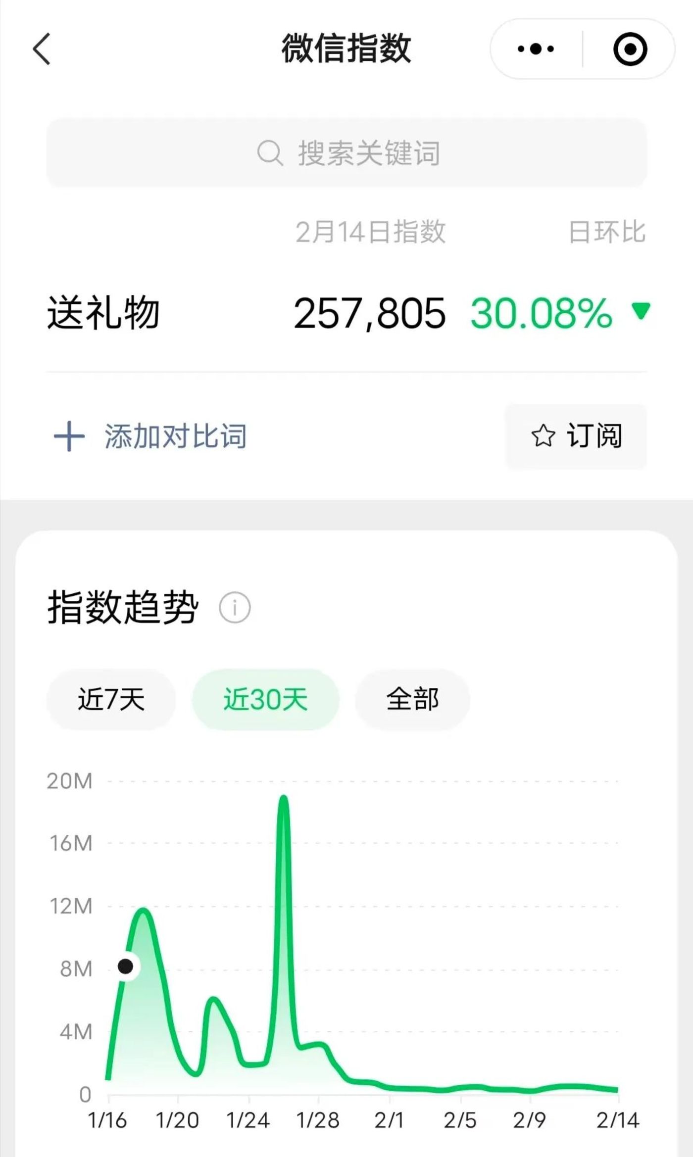 只是,如果不考虑节日这样的特殊节点,“送礼物”的日常需求又有多少?一位图书商家透露,2025年1月,其淘宝店铺的送礼订单在订单总量中的占比极小,整体增量有限。“送礼物”关键词的微信指数趋势也可以作为一种参考,最近30天内的峰值出现在1月26日,陡降后趋于平稳。