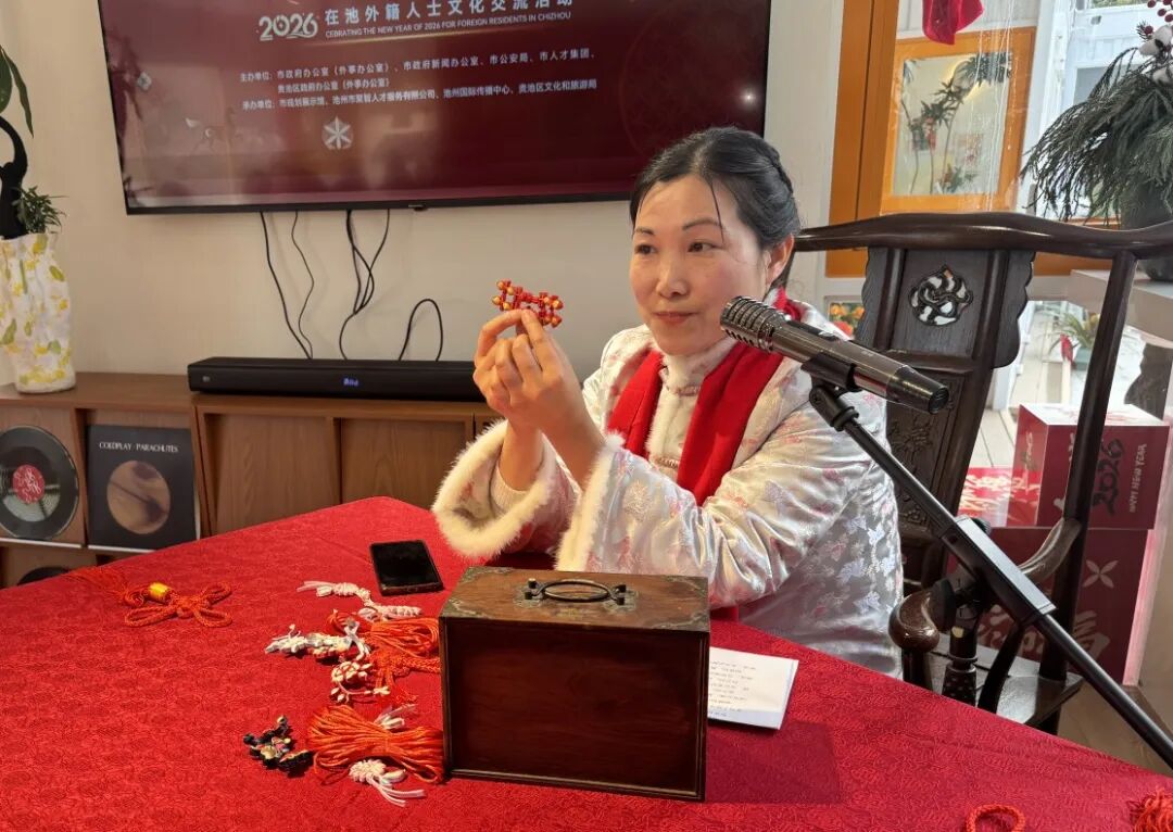 随后,精彩的文化体验环节接连展开。池州陆氏传统旗袍非遗技艺传承人陆晓娟为大家详细介绍了蝴蝶扣、葫芦扣、双喜扣等传统旗袍盘扣的制作工艺。来自俄罗斯的SHARIPOVA ALINA在老师的指导下,很快就掌握了中国结的编织技巧,顺利完成了作品。她告诉记者:“中国结的打法太有意思了,我要把它带回去送给朋友,分享这份来自池州的新年祝福。”