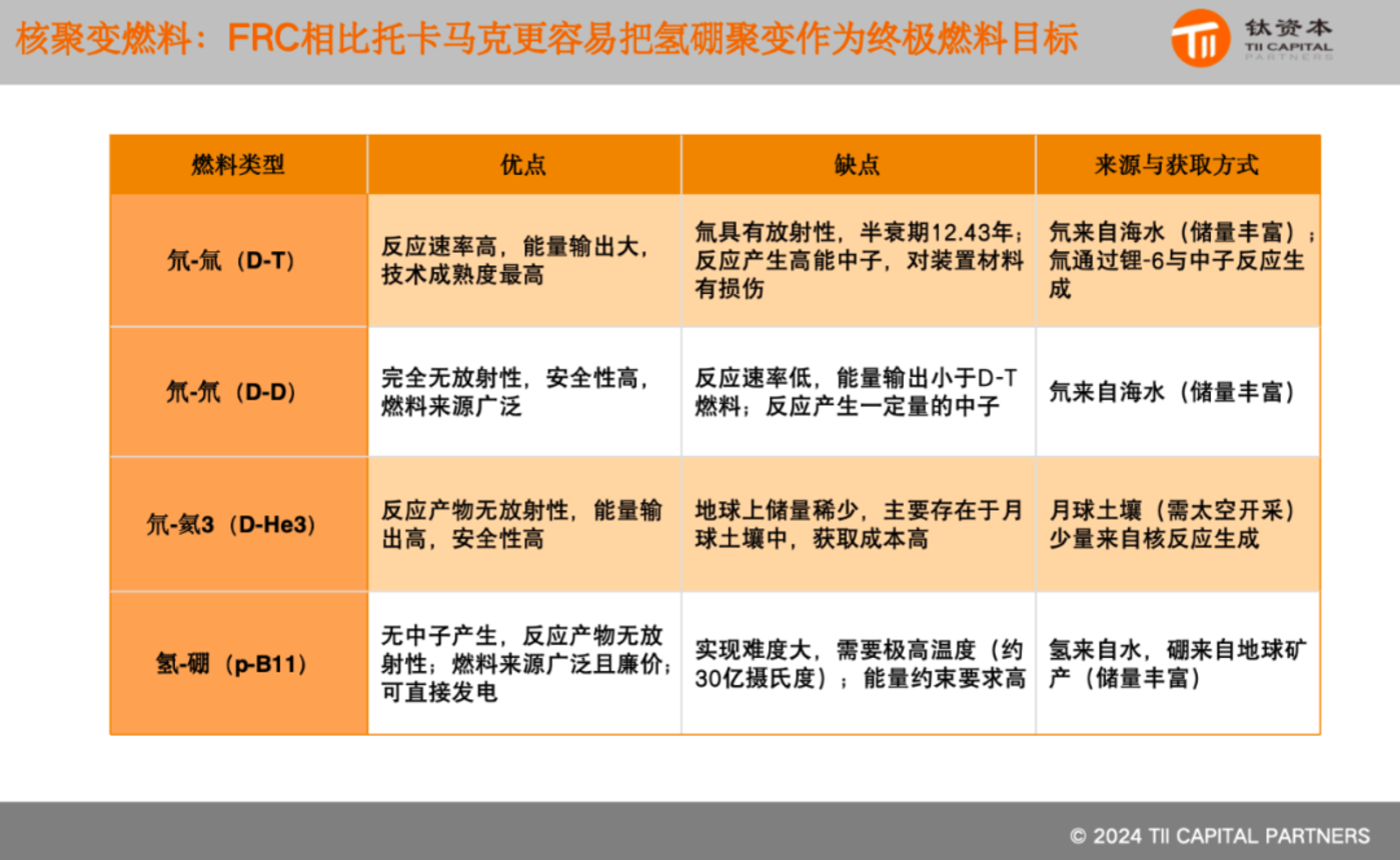 核聚变技术的发展不仅依赖于技术路线的选择,还与燃料的选择密切相关。目前,核聚变的主要燃料包括氘(D)、氚(T)和锂(Li)。氘和氚是最常用的燃料组合,反应相对简单,技术成熟度较高。然而,氚的获取相对困难,通常需要通过锂与中子反应产生,且氚是一种受管制的燃料,不易获得。因此,研究者也在探索其他燃料组合,如氘-氘(D-D)和氘-氦-3(D-He3)。氦-3被认为是一种未来潜力更大的燃料,尤其是从月球开采氦-3的可能性,这可能是中国探索月球的重要原因之一。从核聚变燃料来看,FRC相比托卡马克更容易把氢硼聚变作为终极燃料目标。
