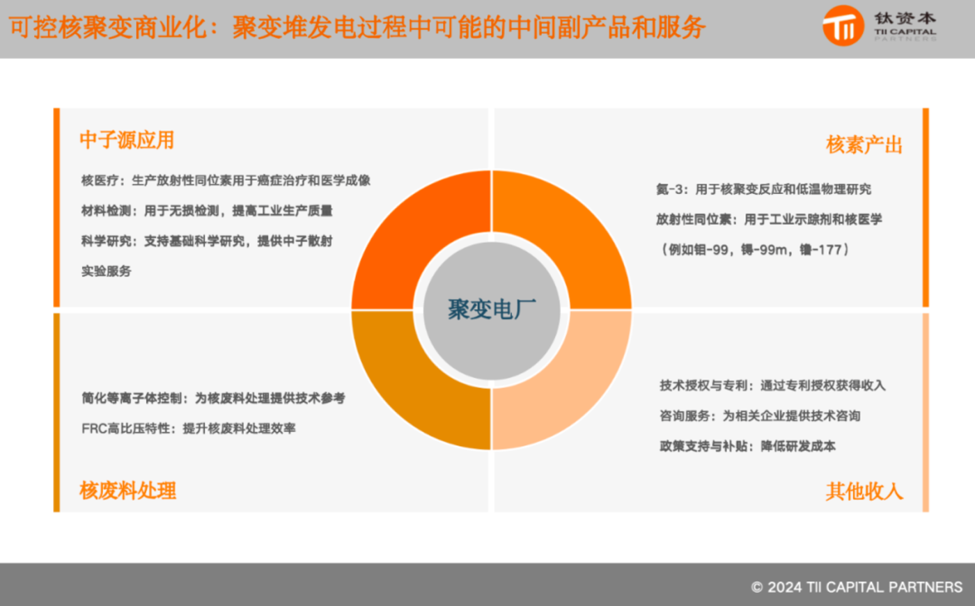 另外,平衡短期与长期商业模式:短期商业模式可能包括中间路线和副产品,如医疗同位素和核废料处理。长期商业模式应聚焦于聚变电厂的建设。投资者需要评估这些模式与自身诉求是否一致。
