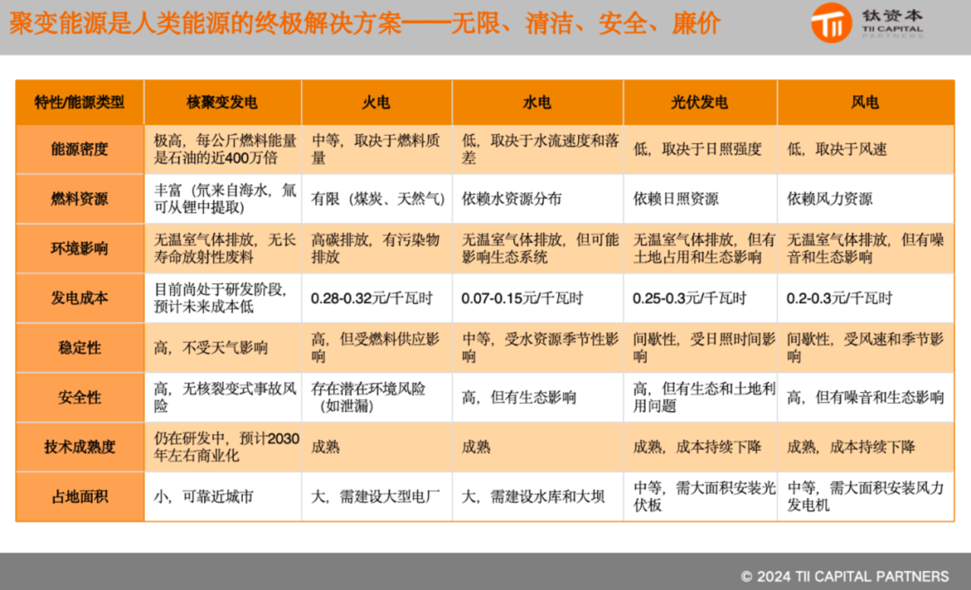 核聚变被认为是人类可能的终极能源。与传统的火电、水电、光伏发电和风电相比,核聚变发电具有无限、清洁、安全和廉价的优势。核聚变反应堆的建设和运营成本虽然高昂,但其能源输出巨大,且对环境的影响较小。核聚变能的开发和应用将成为未来解决全球能源需求的关键技术之一。