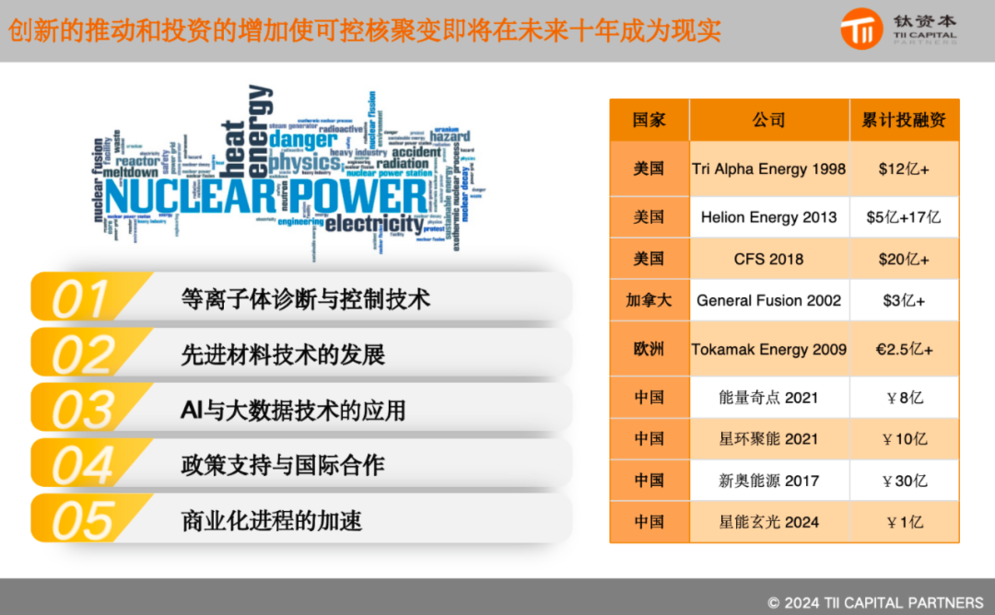 近年来核聚变在中国是一个小风口,2024年,美国和中国的核聚变公司都获得了大量资金用于研发。预计未来一两年,核聚变领域将取得更多突破。投资者可以选择在这些突破出现时布局,也可以提前布局。