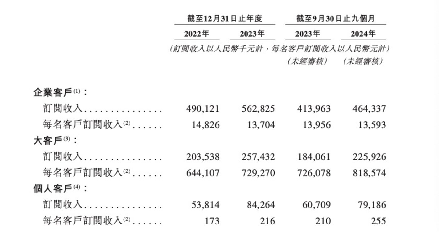 于2022年、2023年及截至2024年前三季,来自企业客户的订阅收入分别为4.9亿元、5.6亿万元及4.6亿元,分别占各期间总订阅收入的90.1%、87.0%及85.4%;其中大客户撑起了企业级订阅收入的半壁江山,分别占各期间总订阅收入的37.4%、39.8%及41.6%。
