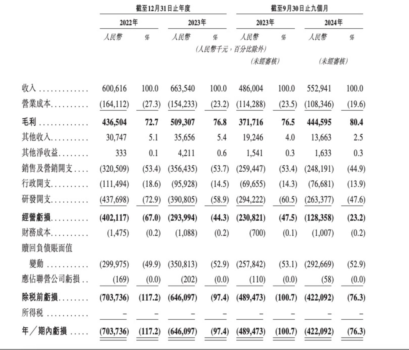 根据招股书,公司经调整淨亏损(非国际财务报告准则计量)从2022年的3.38亿元减少28.3%至2023年的2.42亿元,并从截至2023年前三季的1.99亿元减少52.8%至2024年同期的0.94亿元。