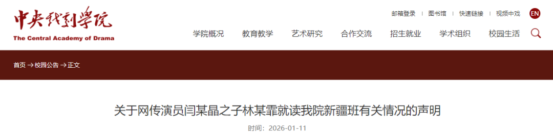 近日,网络上出现有关演员闫某晶之子林某霏曾就读“中戏新疆班”的信息,引发公众关注与讨论。经核查,现作出如下声明。