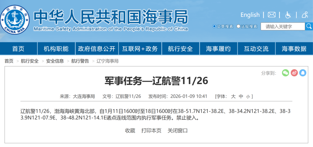 据中国海事局网站消息,大连海事局发布航行警告,1月11日16时至18日16时,渤海海峡黄海北部部分海域执行军事任务,禁止驶入。