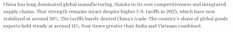 文章分析认为,长期以来,中国凭借成本优势和完整的供应链主导全球制造业。尽管2025年美国关税提高至50%左右,但中国的出口韧性依然强劲——其全球商品出口份额稳定在14%左右。原因在于,中国已成功拓展了贸易伙伴。对美出口仅占中国GDP的2%-3%,而超过一半的商品出口流向全球南方经济体,包括东盟、拉美、中东和非洲。此外,中国的出口结构也在升级,电子产品、汽车等知识密集型产品占比提升,而家具、玩具等劳动密集型产品减少。