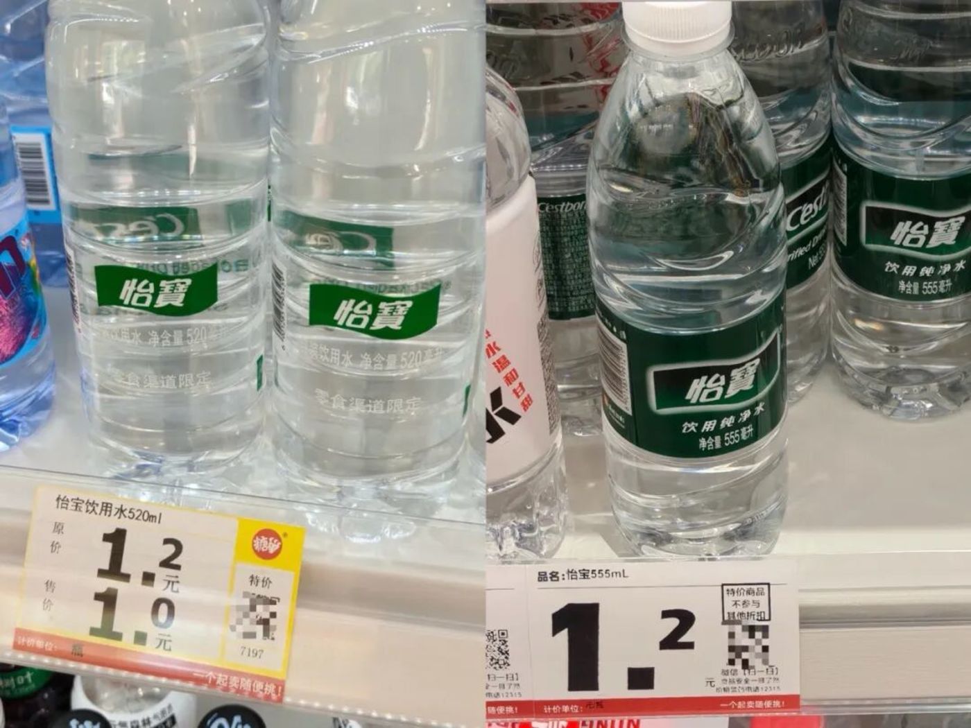 我们发现,糖巢零食所售的一款怡宝包装饮用水为“零食渠道限定”,规格为520ml(常规为555ml),零售价1元一瓶;同比赵一鸣在售的555ml怡宝饮用纯净水售价1.2元。