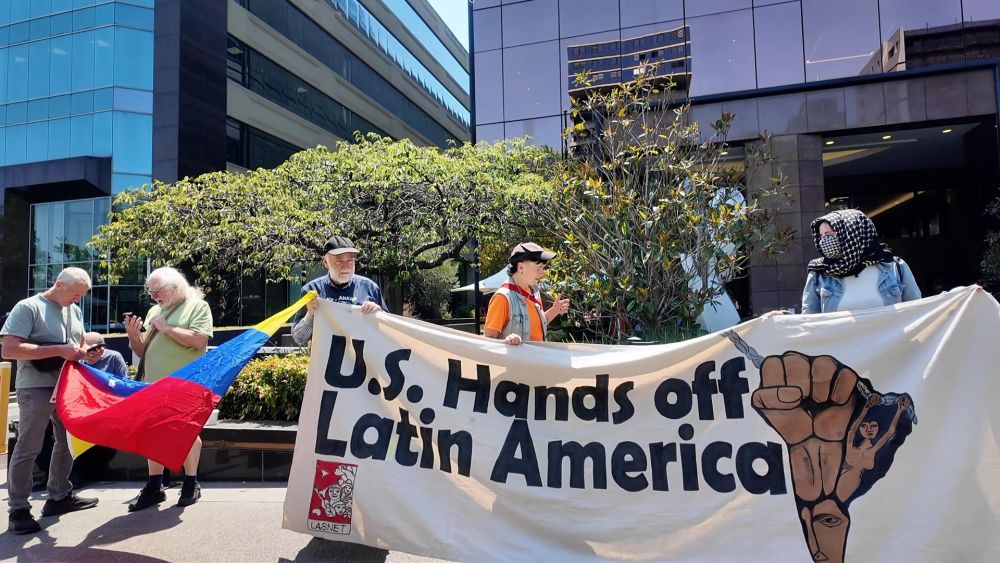 1月12日,澳大利亚墨尔本民众在美国驻墨尔本总领事馆门口举行抗议活动。抗议者手持委内瑞拉国旗以及写有“美国停止干涉委内瑞拉”字样的旗帜,反对美国对委内瑞拉的军事行动。