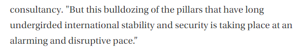 文章援引曾在奥巴马政府担任外交政策顾问、现为美国国家安全咨询公司“全球形势工作室”(Global Situation Room)负责人的布雷特·布鲁恩(Brett Bruen)的话说:“这种对长期以来支撑国际稳定与安全支柱力量的破坏,其速度之快令人震惊,且极具破坏性。”