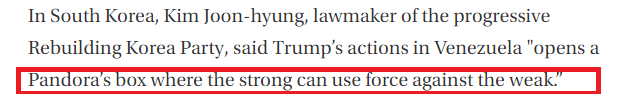 此外,文章还表示,美国的做法也引起了其亚洲盟友的焦虑。韩国祖国革新党议员金俊亨日前(Kim Joon-hyung)表示,美国政府在委内瑞拉的行动“打开了一个潘多拉魔盒,即强者可以对弱者使用武力”。