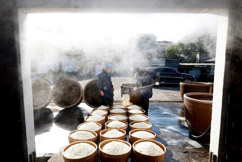 ↑1月11日,在浙江省东阳市马宅镇屠梁村钟山自然村,酿酒师傅在捞米。新华社发(胡扬辉摄)