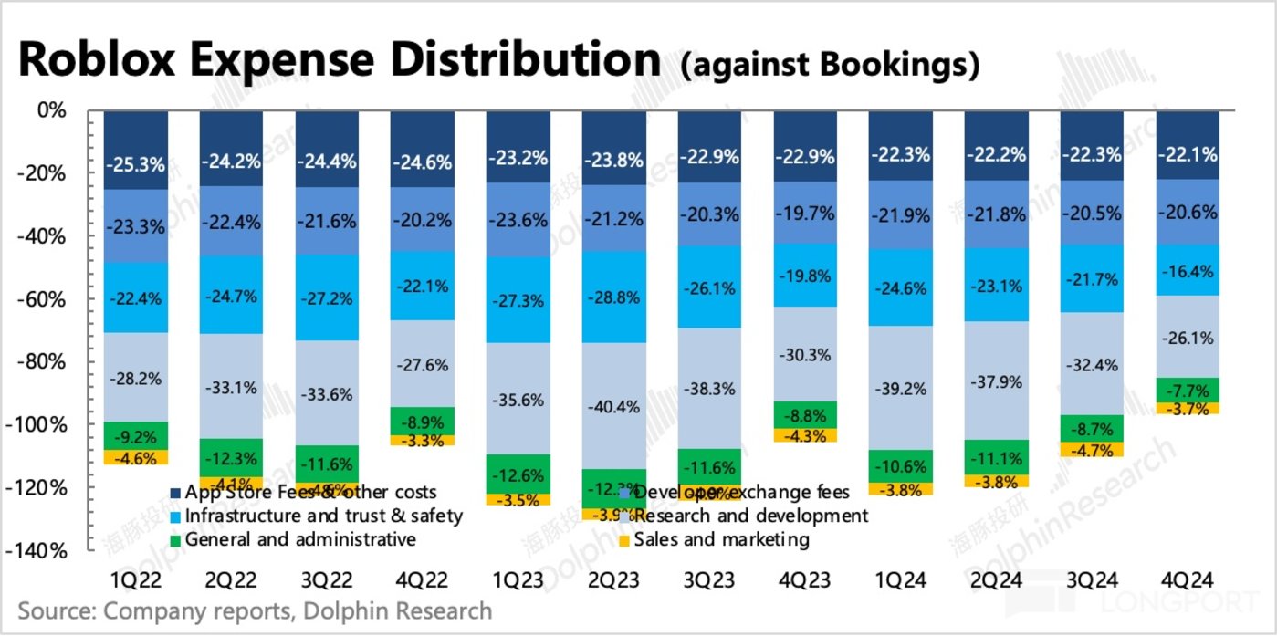 而回到短期上,DAU 和 Bookings 也已经从年底重新回升。四季度展现出的,忠实用户的粘性仍在增加,人均变现效率在提升,更重要的是 Roblox 的经营效率和规模效应已经通过过去一年的表现向市场展现出来。再加上引导用户绕道苹果税的操作,在获得更高毛利率的同时,也顺势提高了开发者获得的分成收入,有望激励开发者生产更多的优质游戏,丰富平台生态。