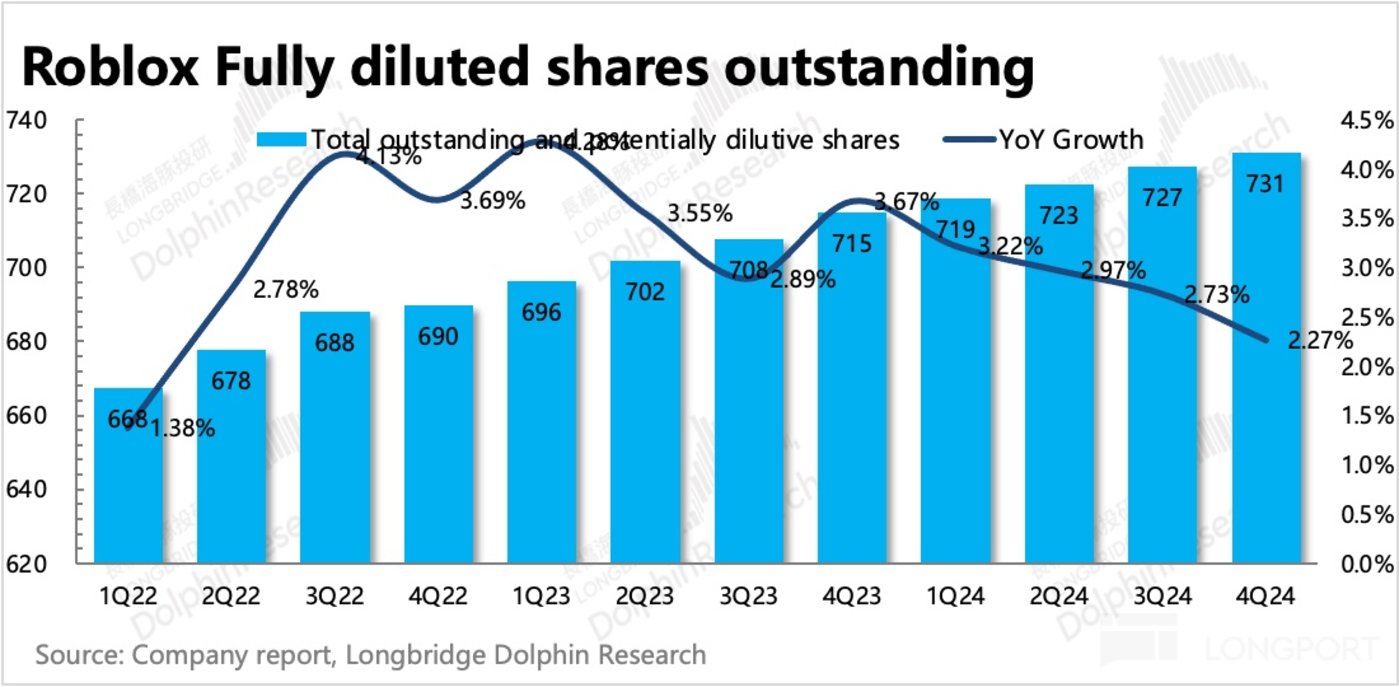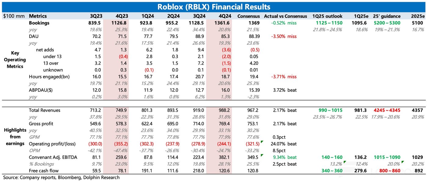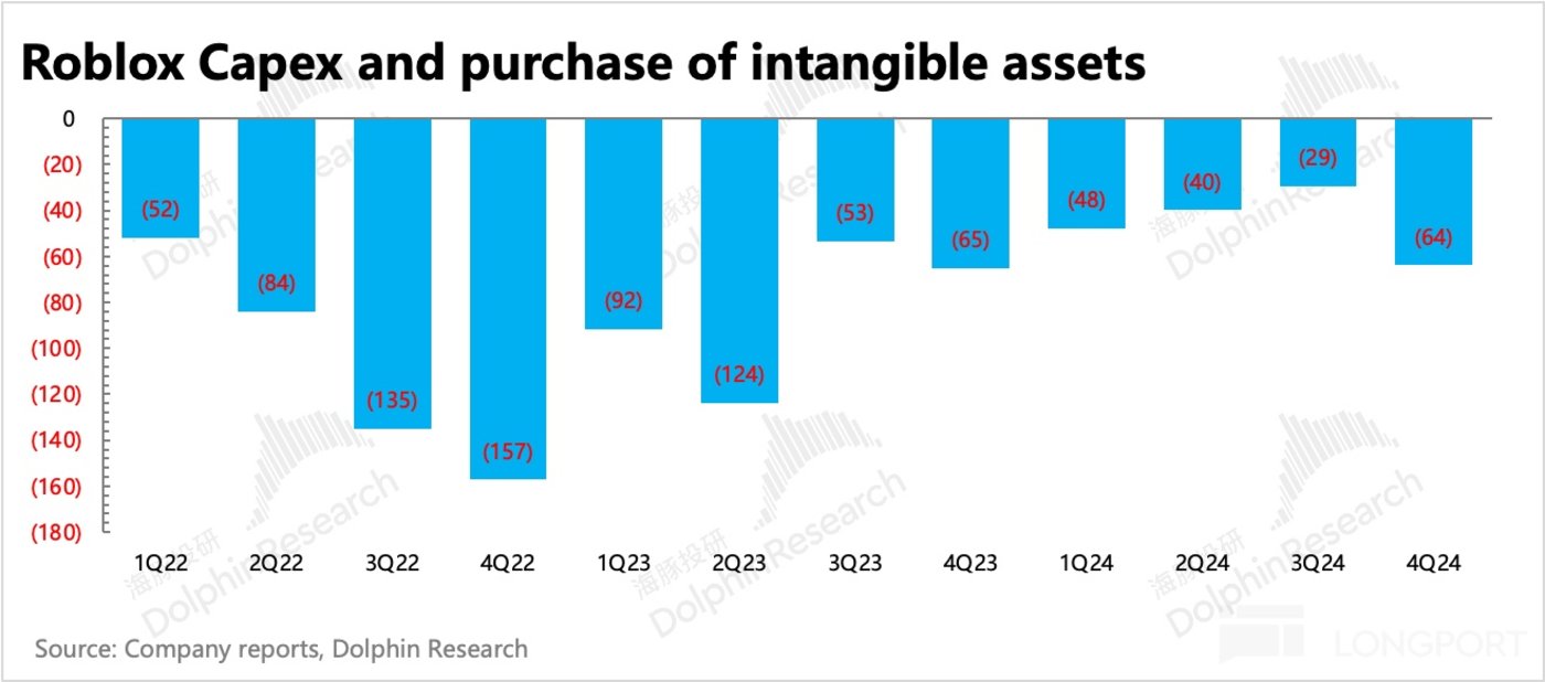关于 Q1 以及 2025 年的利润目标,管理层仍然维持同比提升 100~300 基点的改善节奏,但电话会中透露并未将降本的考虑包含其中。因此这里的改善空间有望超出指引,除了费用端继续严控外(但人员成本会有个位数增速的增长),还会出现成本端的优化——今年年初,Roblox 开始引导用户通过官网 web 进行充值,并给予更多的 Robux 币激励,从而绕开移动端的 “苹果税”、“谷歌税”。