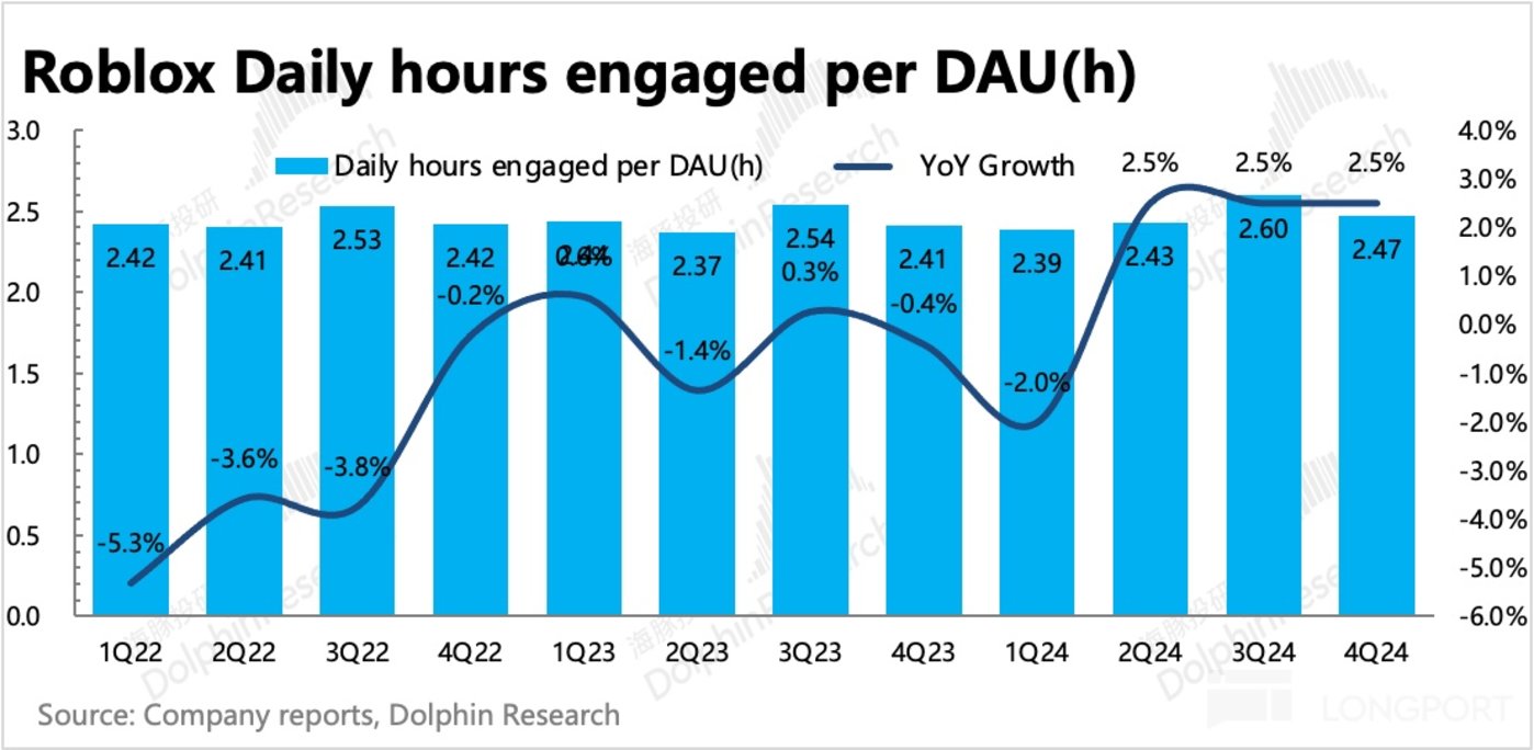 四季度 DAU 和用户总时长均不及预期,季节性波动也显著大于去年,从而引发市场对 Roblox 生态扩张持续性的担忧。