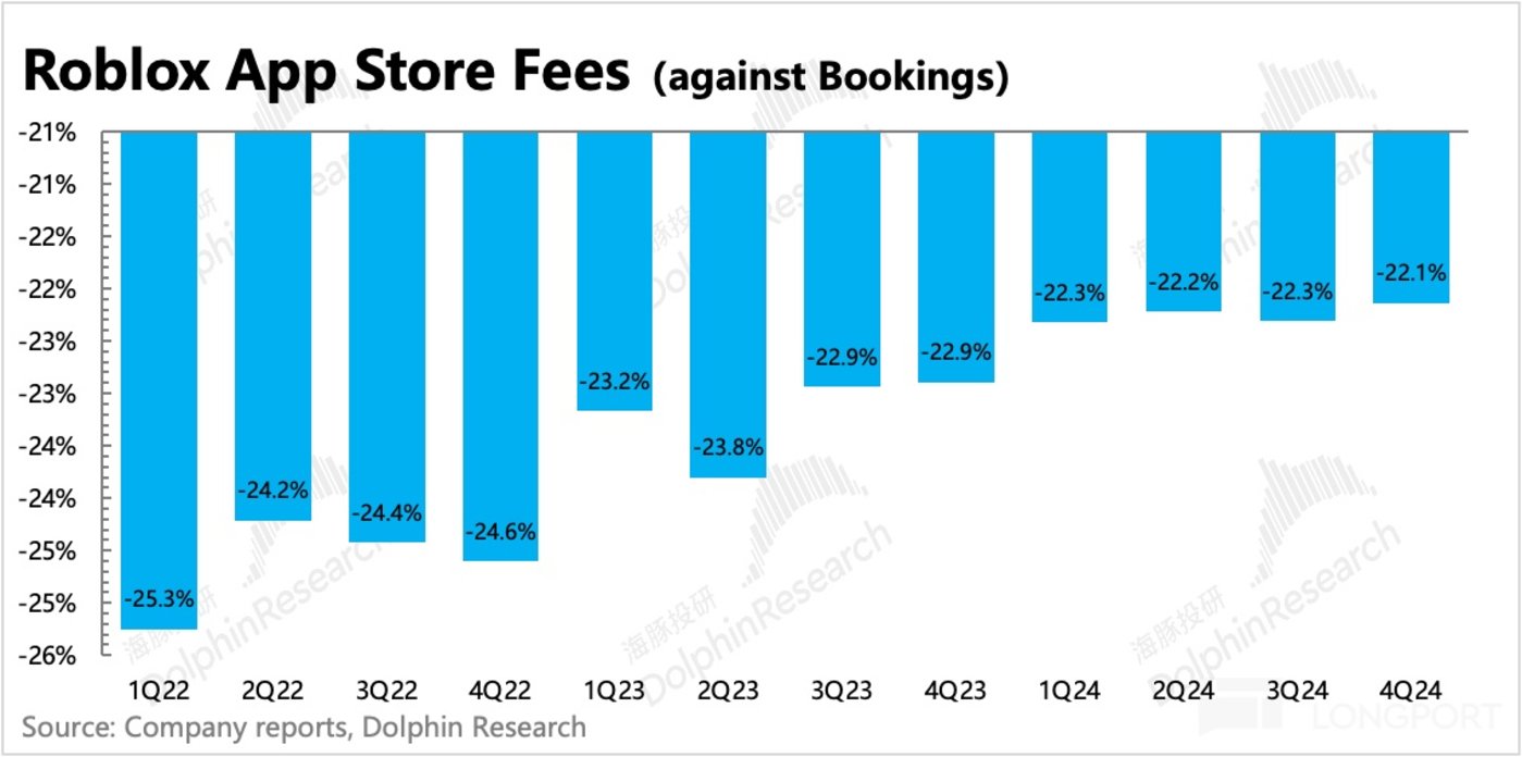 除此之外,今年年初,Roblox 开始引导用户通过官网 web 进行充值,并给予更多的 Robux 币激励,从而绕开移动端的 “苹果税”、“谷歌税”。海豚君简单计算,流水中每 10% 绕过苹果税,那么对终端 EBITDA 的影响也会增加约 10%,这个空间可以让渡更多的流水分成给到开发者。