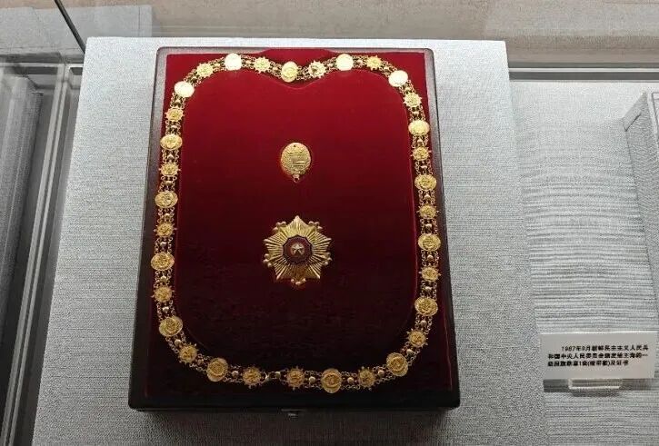 1987年9月,朝鲜民主主义人民共和国中央人民委员会颁发给王海的一级国旗勋章1套(绶带款)