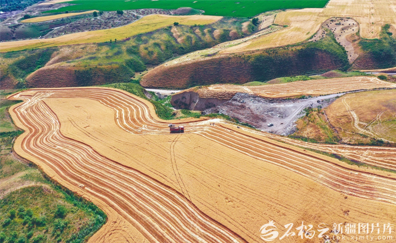 新源县则克台镇则克台村,大型收割机在麦田里作业(资料图片)。张文庭摄