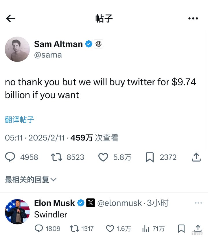 对此,奥尔特曼在社交平台上隔空“阴阳”回应:“谢谢,不。但如果你愿意的话,我们愿意以97.4亿美元的价格收购推特(特意称X为推特)。”