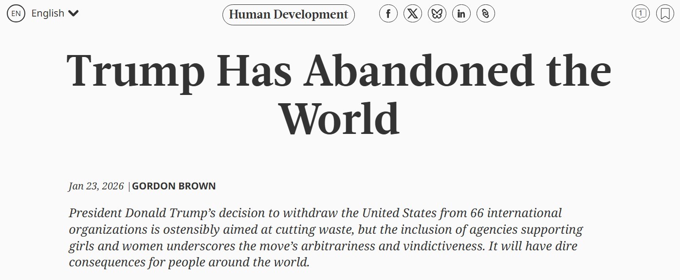 布朗在文章中指出,美国宣布退出的66个国际组织中包括31个联合国下属机构和35个非联合国机构。他批评说,从未有任何一国领导人,能在短短一个月内如此全面地切断本国与国际社会的联系。