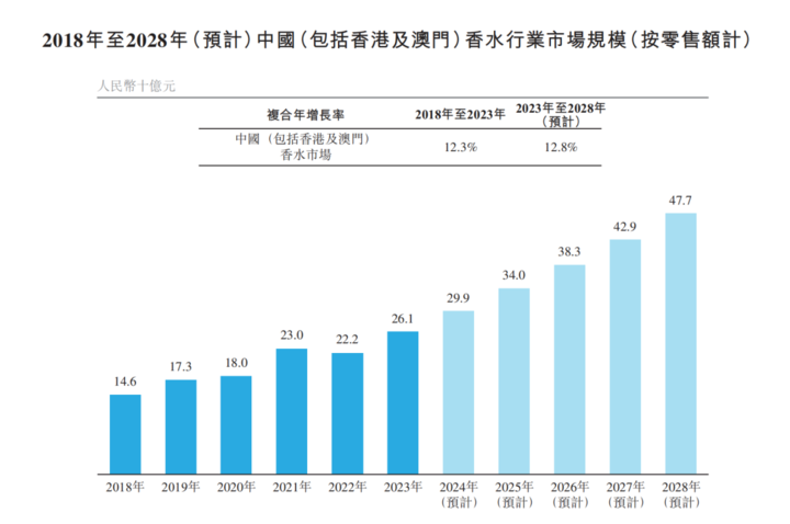 从1988年在北京一家百货公司开设香水精品专柜开始,到如今叩动IPO的大门,颖通的发展与中国香水市场的发展相辅相成。中国香水零售市场规模由2018年的146亿元人民币增加至2023年的261亿元人民币,复合年增长率约为12.3%,且仍在继续增长。