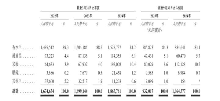 其中,香水是颖通的核心收入来源,在2022-2024财年(截至3月31日年度)香水收入占比分别为89.3%、88.5%、81.7%,其他品类中彩妆的收入比例从2022年的3.9%提升到2024年的10.5%。