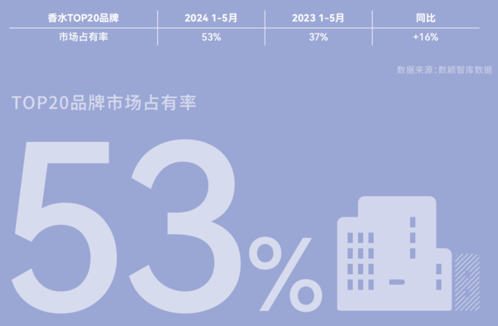 根据2024年1-5月淘京抖数据来看,线上香水市场整体生意同比下滑34%,然而头部品牌抗跌能力强,同比仅下滑5%,同时市场份 额持续提升,TOP20品牌市场占有率达53%,较上年提升了16%。
