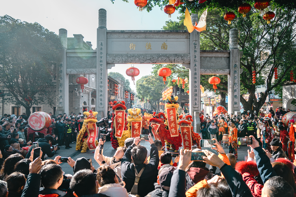 2025年春节期间,福州三坊七巷南后街牌坊下舞狮表演吸引游客驻足观看。 福州名城保护开发有限公司供图 陈鑫贤/摄