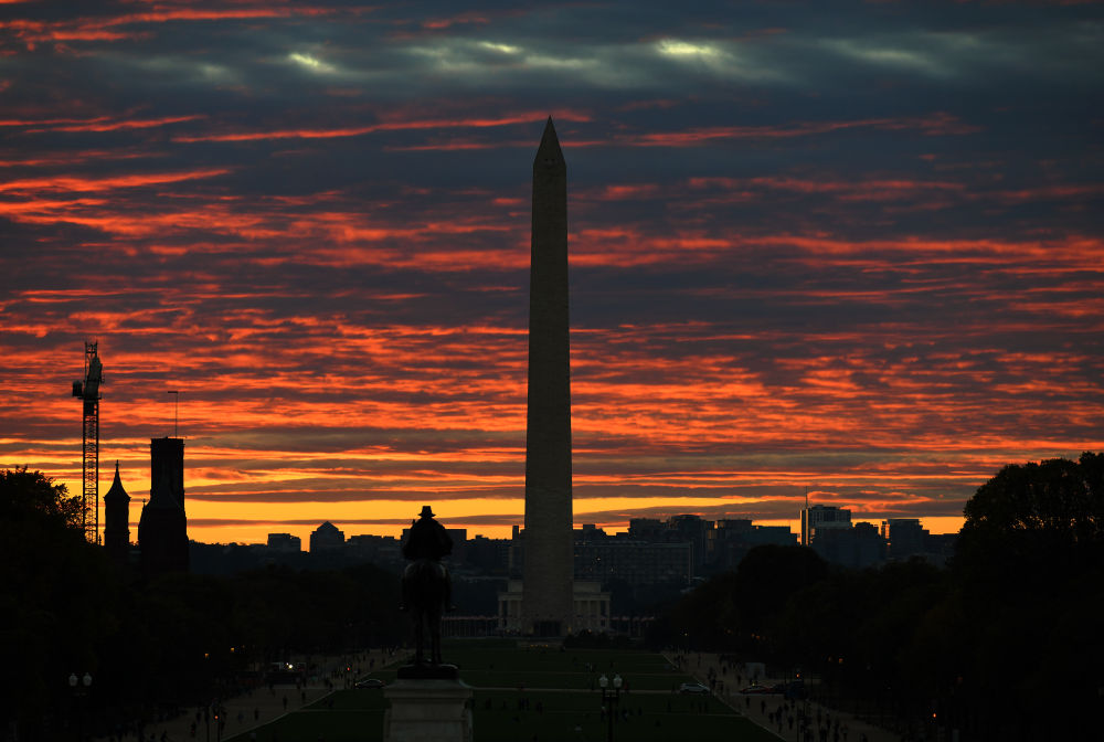 这是2025年10月15日拍摄的日落时分的美国华盛顿纪念碑。新华社记者李睿摄