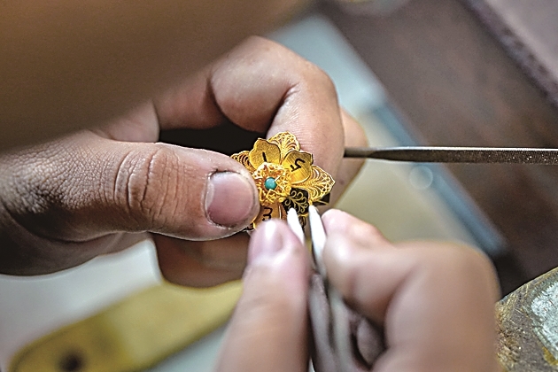 匠人在铜板上錾刻纹路凹槽。新华社发