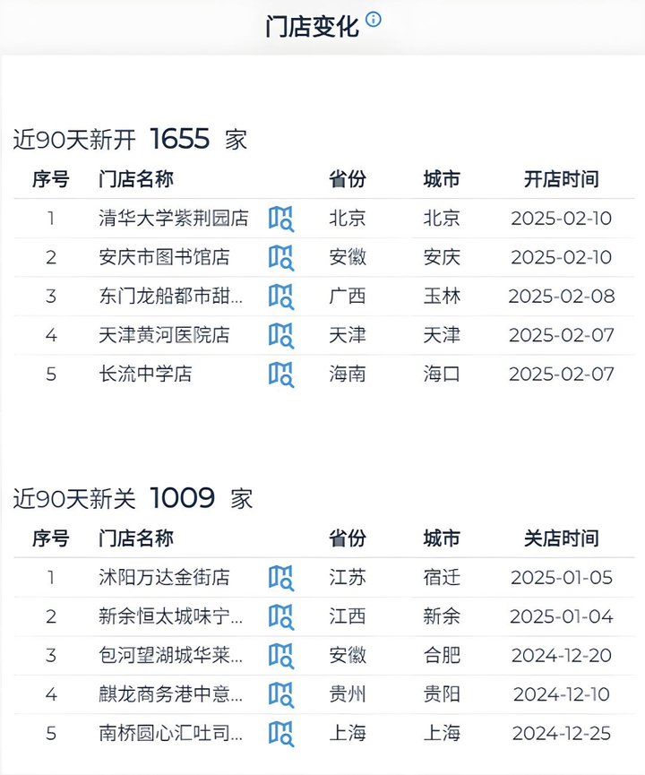 作为对比,瑞幸尽管在加盟门槛上依然严格把关,其门店数量依旧早早突破了2万家。过去90天,瑞幸新开门店1825家,新关门店仅为282家。