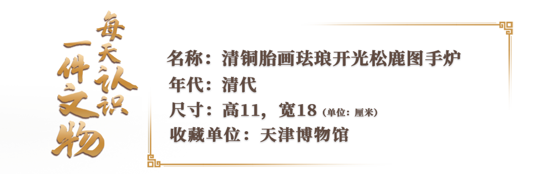这件清铜胎画珐琅开光松鹿图手炉