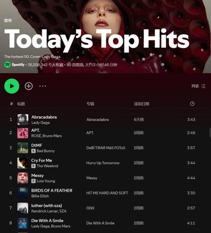 众所周知,Spotify官方编辑团队策划的“今日热门”(Today’s Top Hits)和“周五新歌”(New Music Friday)等头部歌单占据着核心曝光位。以“今日热门”(Today’s Top Hits)歌单为例,其凭借高达3520万的关注数稳居流量高峰。进一步观察歌单内容,不难发现其与“十亿俱乐部”歌单之间存在着显著重叠,诸如《Die With A Smile》和《APT》等跻身“十亿俱乐部”的现象级歌曲,几乎总是“今日热门”榜单上的常客。