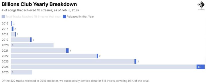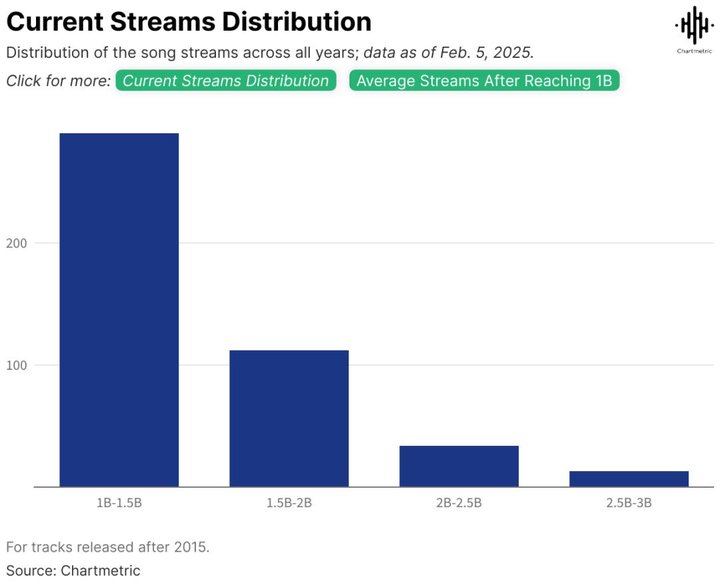 根据Chartmetric的数据,Spotify平台突破10亿流媒体播放量的歌曲,其后续平均播放量通常稳定在15亿左右,而20亿量级则构成了新的分水岭——目前仅有47首歌曲突破这一阈值。