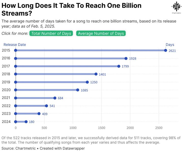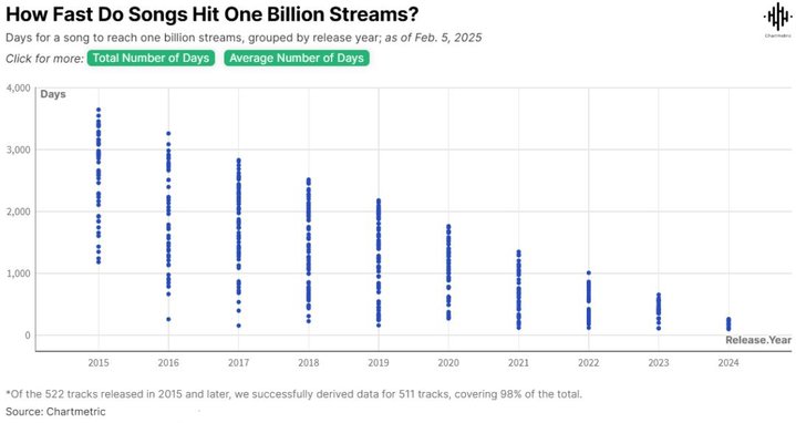 近日Chartmetric发布的一项统计显示,如今有越来越多的歌曲发行短期内在Spotify突破10亿播放量。