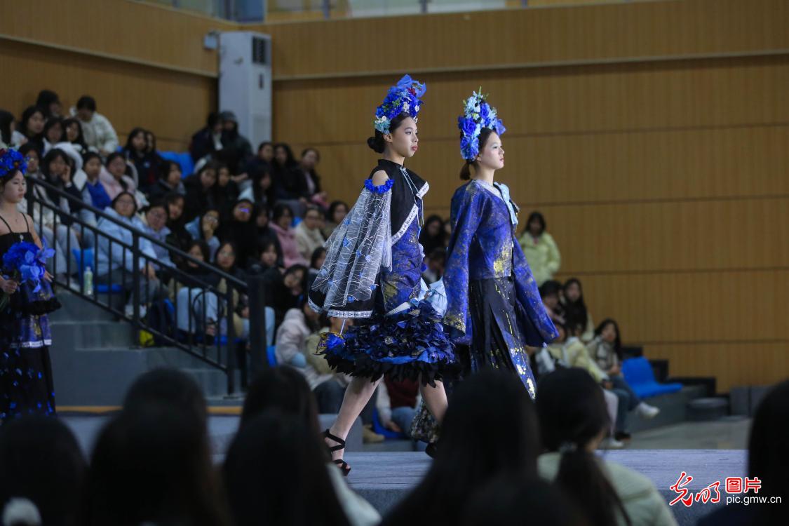 近日,湖南省邵阳市隆回县职业中等专业学校服装专业举行以“拾遗·织梦”为主题的2026届学生毕业设计作品展。作品展共19个系列,120多套服装进行集中展示,学子原创作品融合传统技艺与现代创意,以针线织就匠心,用设计诠释梦想。这场青春时尚盛宴,尽显职教学子风采与产教融合育人成果。图为模特社团学生展示服装专业毕业生们设计的服装。(曾勇摄/光明图片)