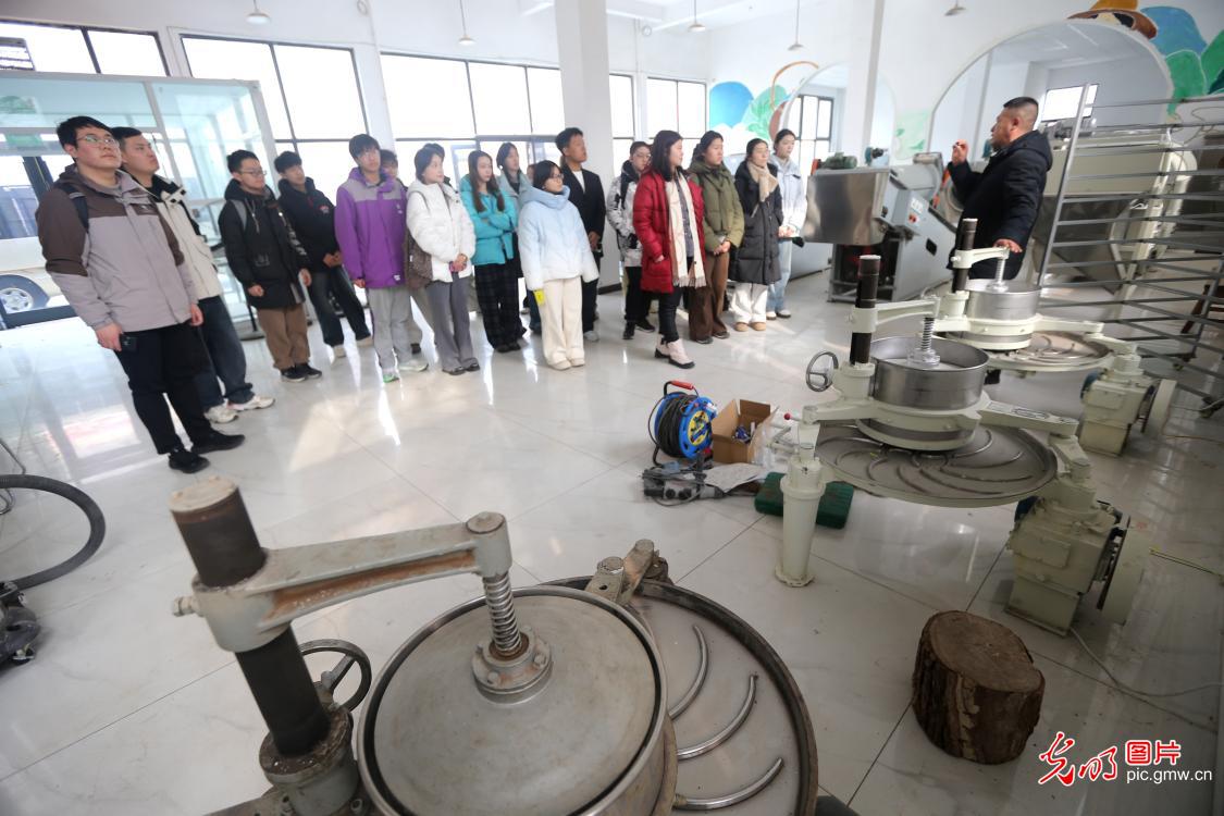日前,江苏省连云港市连云区人社局为全力推进高校毕业生高质量就业创业,组织40余名高校学子开展沉浸式城市探访,参观重点企业和乡村创业园,旨在通过沉浸式参观体验,让青年学子深入了解港城产业发展蓝图与文化底蕴,切实打通人才服务的“最后一公里”,搭建起校企对接、人才留连的沟通桥梁。图为大学生在乡村企业参观。(王春摄/光明图片)