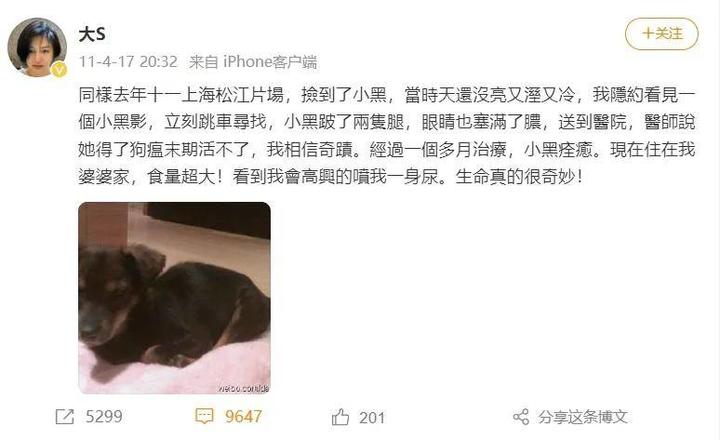 如果你曾浏览过大S的微博,会看到不止小黑,许多只流浪的毛孩子都曾活跃在那里。