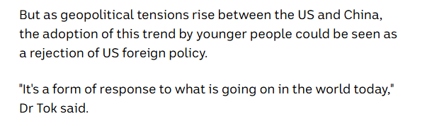 文章还说,许多创作“中国时刻”视频的博主居住在美国。墨尔本大学亚洲研究院讲师杜兆恺分析,年轻人的这种文化选择或许是对美国外交政策的隐性反抗。“这是对当今世界格局的回应。”