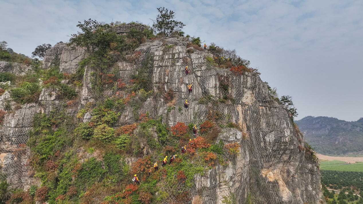 一个半小时后,“爬山虎”突击队抵达崇左市的一个作业区,四周全是陡峭的石山。队员们从车上卸下装备,开始穿戴安全绳和安全帽。“主要任务是检查既有的主动网、被动网是否有松动、脱落、锈蚀,或者有包裹不到位的危石”,杨发登和队员们要严格按照要求在天窗期内,也就是没有火车通过的时候作业,施工时间有限。